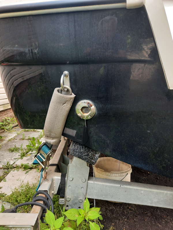 Получается там крюк и лодка за нос тянется к прицепу, и такие же 2 сзали слева и справа. И никаких тебе плясок с ремнями через весь корпус. Просто 3 троса к раме сантиметров по 40 каждый.